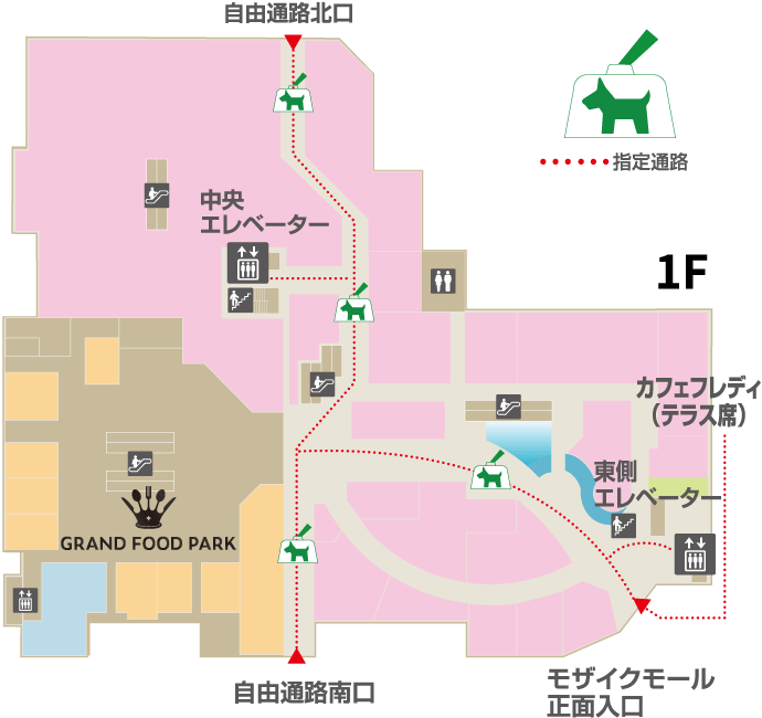 ① ペットご同伴の際は、頭を入れた状態でキャリーバッグ・ペットカートご使用の上、下記指定通路、および指定エレベーターをご利用ください。
