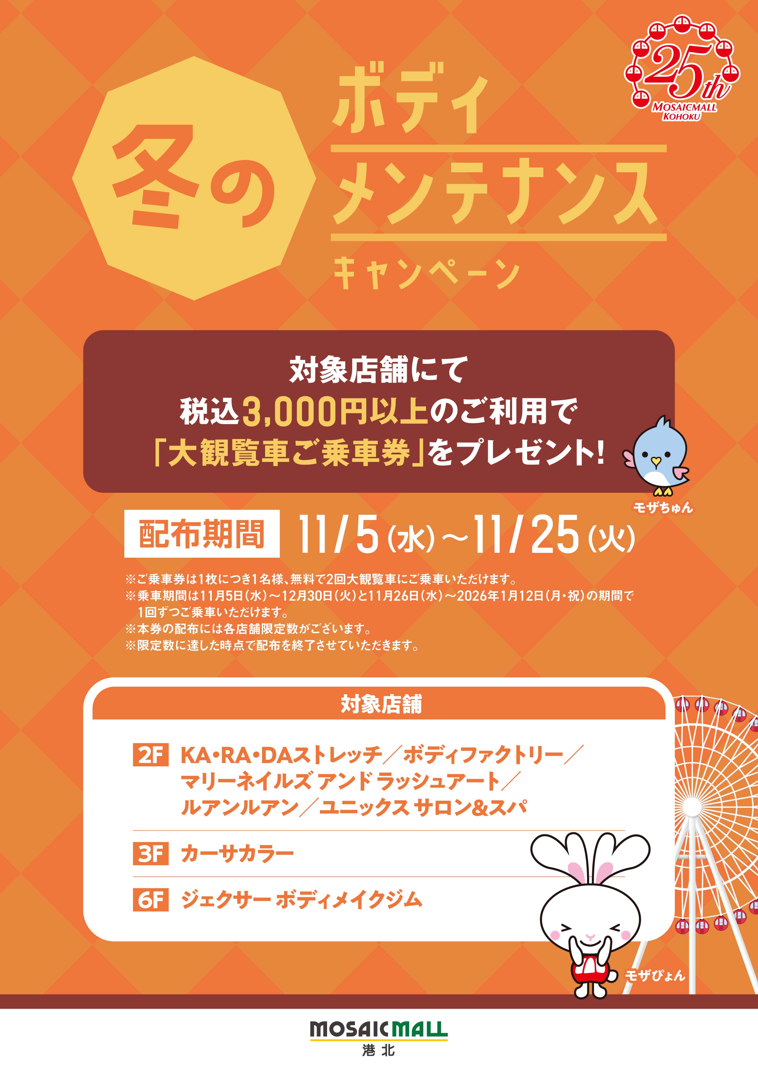 冬のカラダを温める、お得なキャンペーンを開催いたします。対象店舗にて1会計 税込3,000円以上のご利用で大観覧車ご乗車券(2回分)をプレゼント!