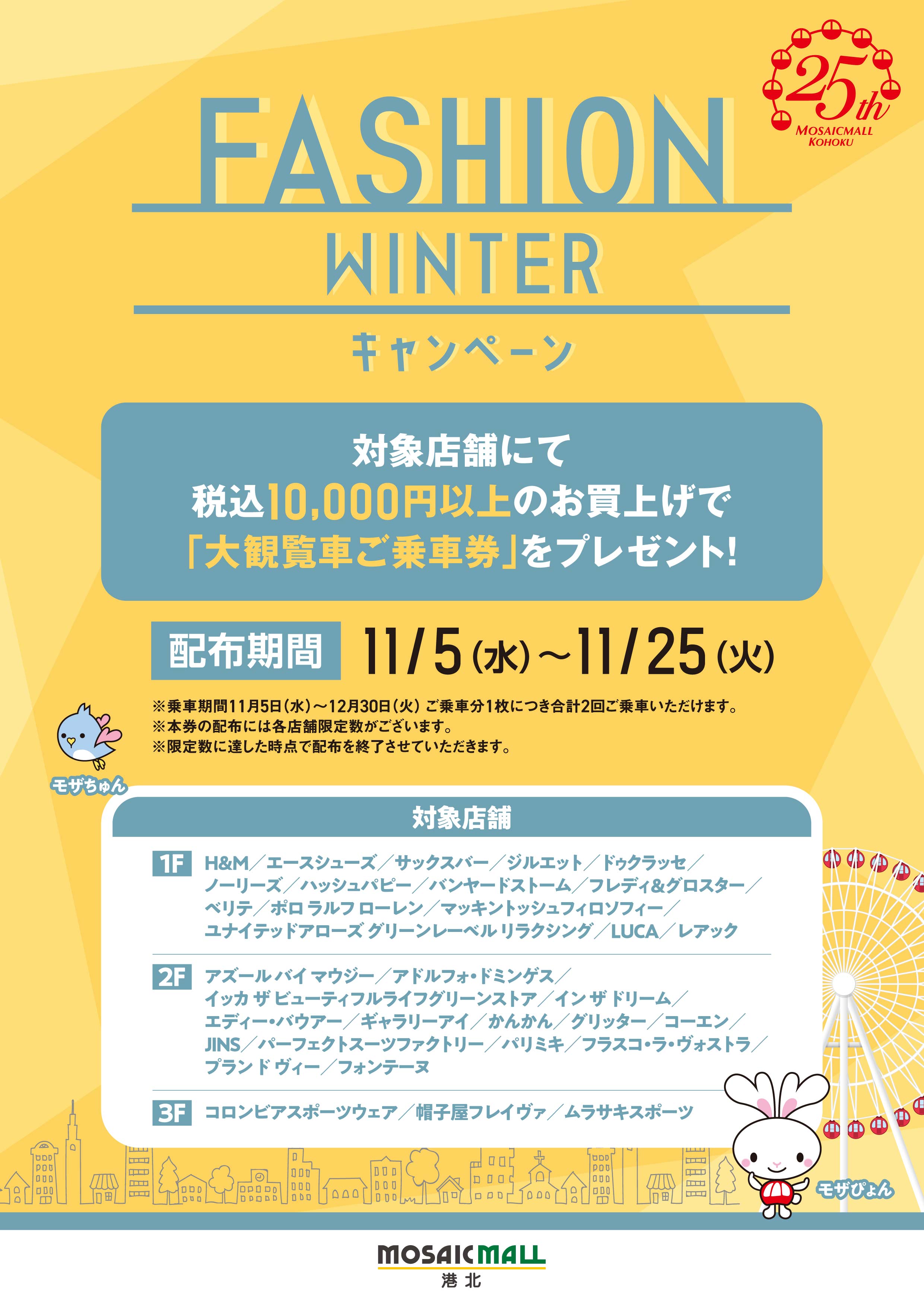 ファッション店舗でお買い上げでお得なキャンペーンを開催いたします。対象店舗にて1会計 税込10,000円以上のお買い上げで大観覧車ご乗車券をプレゼント!