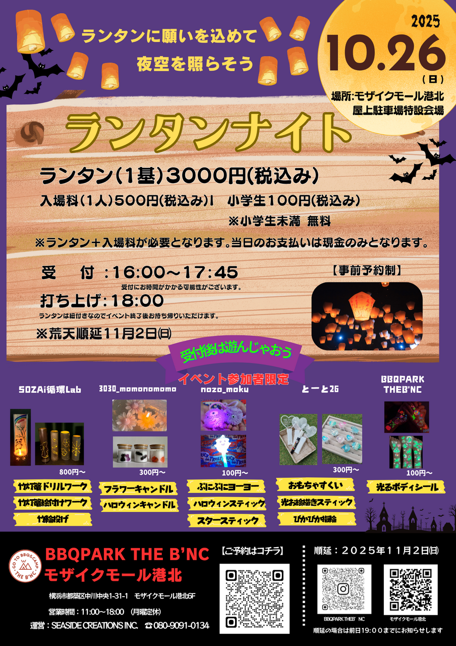 ・延期の場合は、前日の19:00までにBBQPARKTHEB'NC Instagram及びモザイクモール港北HPにてお知らせ致します。