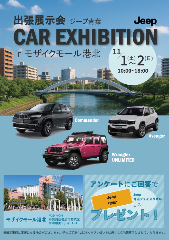 こんにちは。Jeep(ジープ)の人気モデルが展示される特別イベントを開催します!