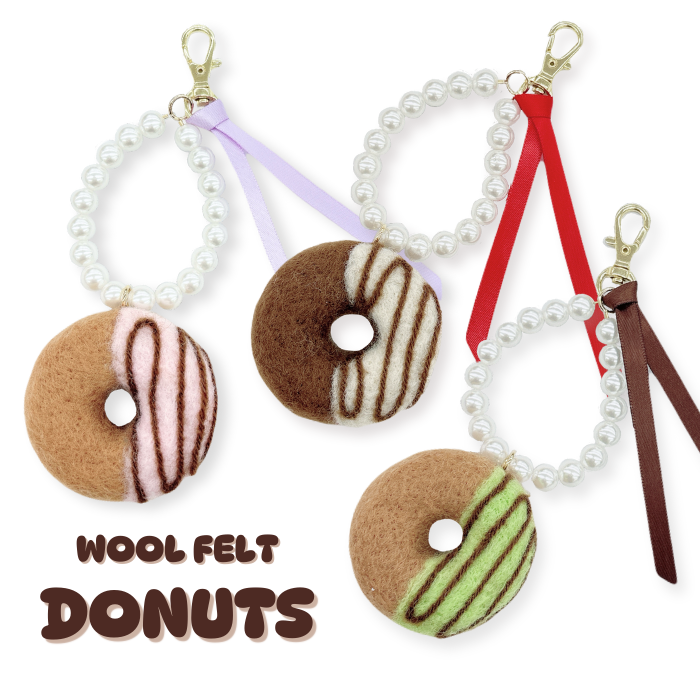 羊毛フェルトでドーナツを作り、バレンタインらしいチャームにします。