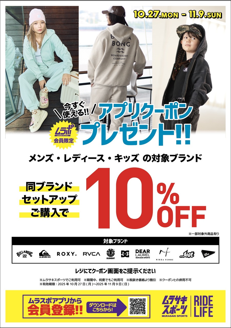 この時期に大活躍するセットアップをお得に買えるクーポンムラサキスポーツの公式アプリ「ムラポ」に登録されている方全員にプレゼント!同じブランドのセットアップが10%オフで買えちゃいます。もちろんその場で登録されても、プレゼントされますよ!