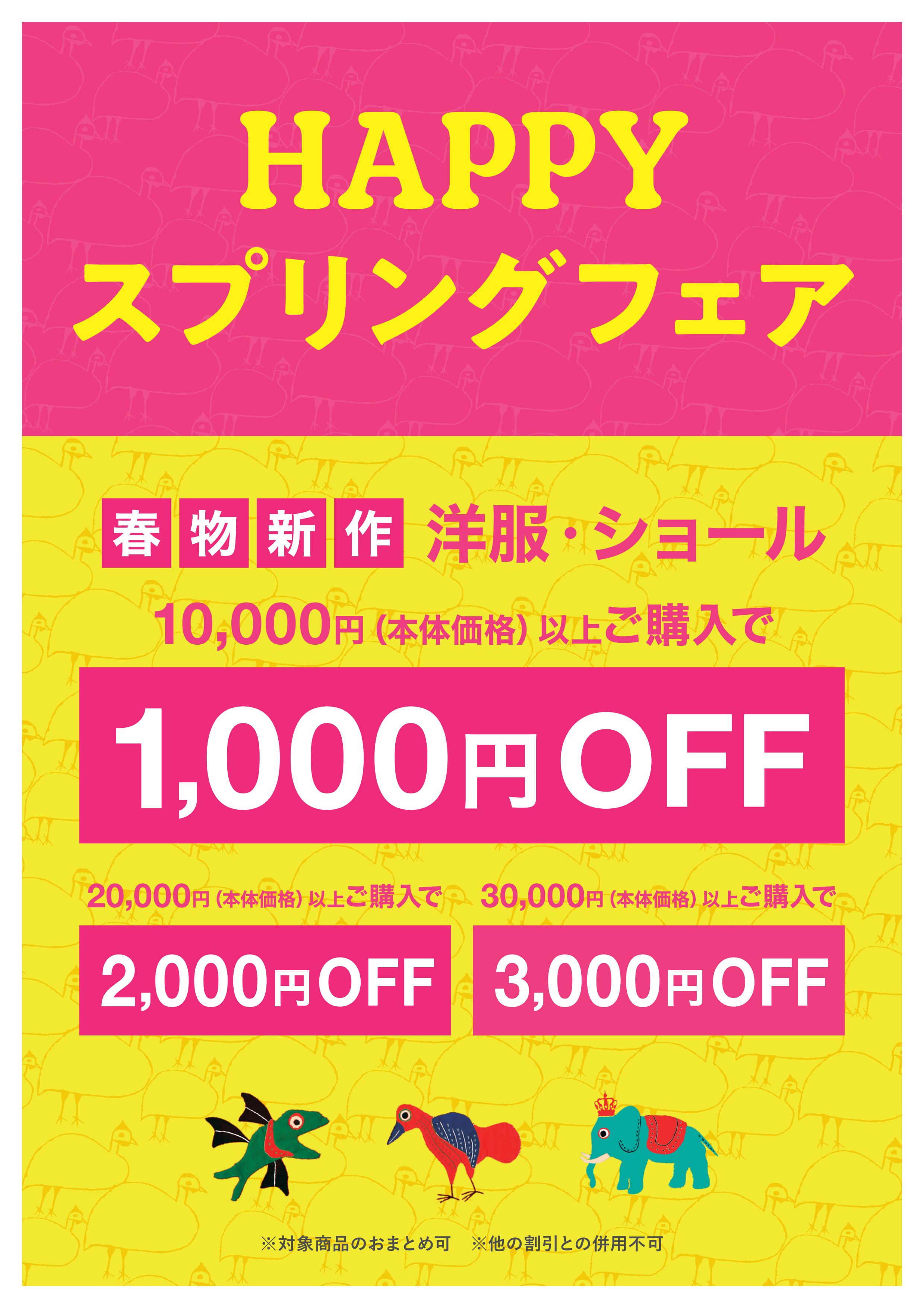 新作のお洋服・ショールをお買い上げ10,000円毎にレジにて1,000円引きとなります。