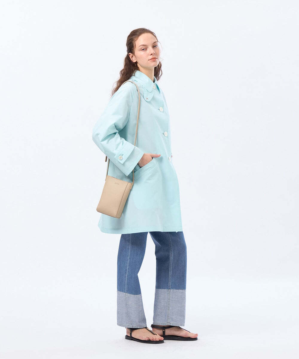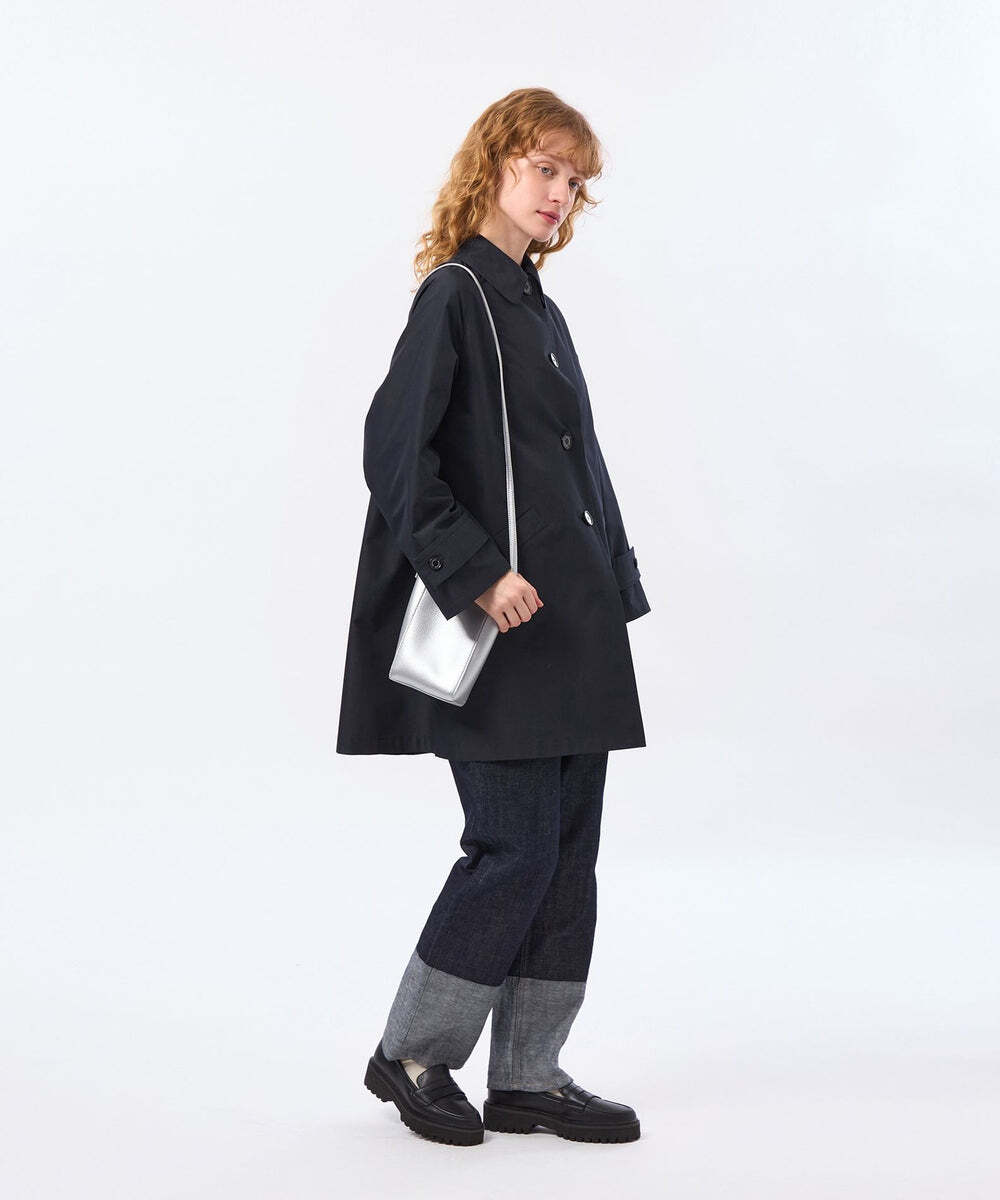 小ぶりな衿と上目に配したフロントボタンのバランスで、全体的にコンパクトな印象に仕上げています。ゴールドスタッズでクラス感のあるチンフラップ付きで、衿を立ててチンフラップを閉じると、モードな印象に。