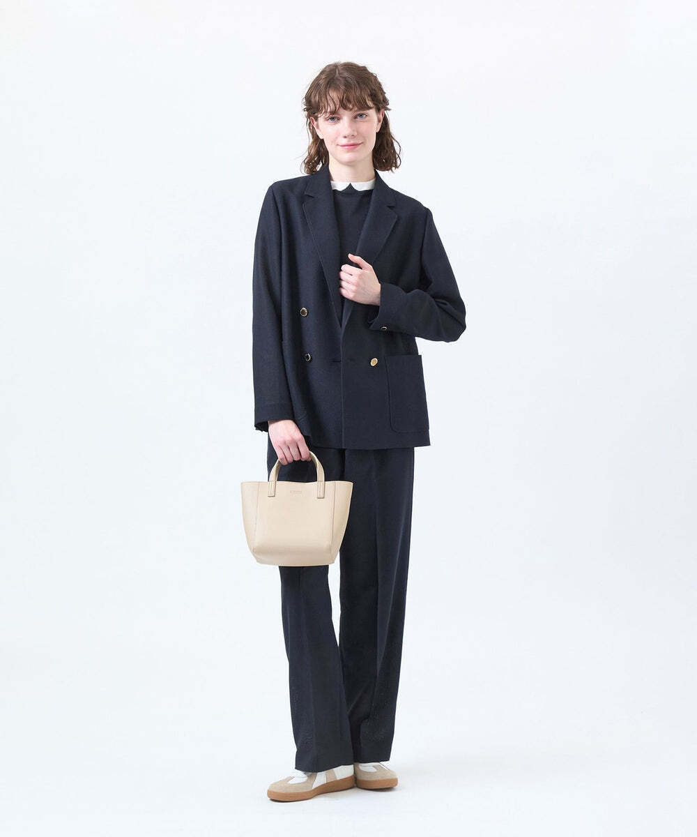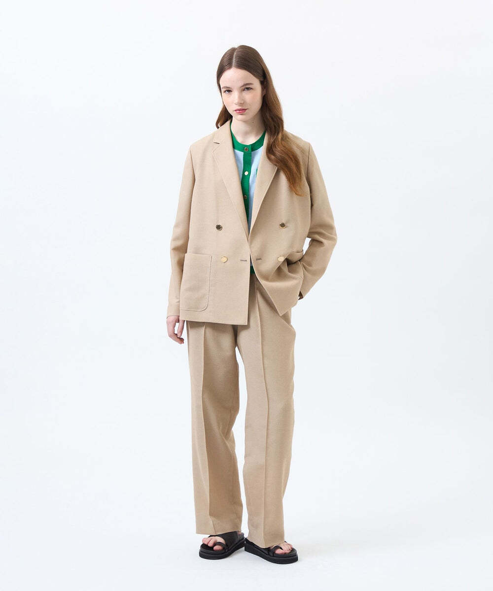 メッシュ状のカラミ織が涼やかな、ボックスシルエットのブレザー。共布のワイドイージースラックスと共に、吸水速乾と防シワ機能を備えているため、移動の多い日にも重宝します。品良くまとまる初夏のワークスタイルです。