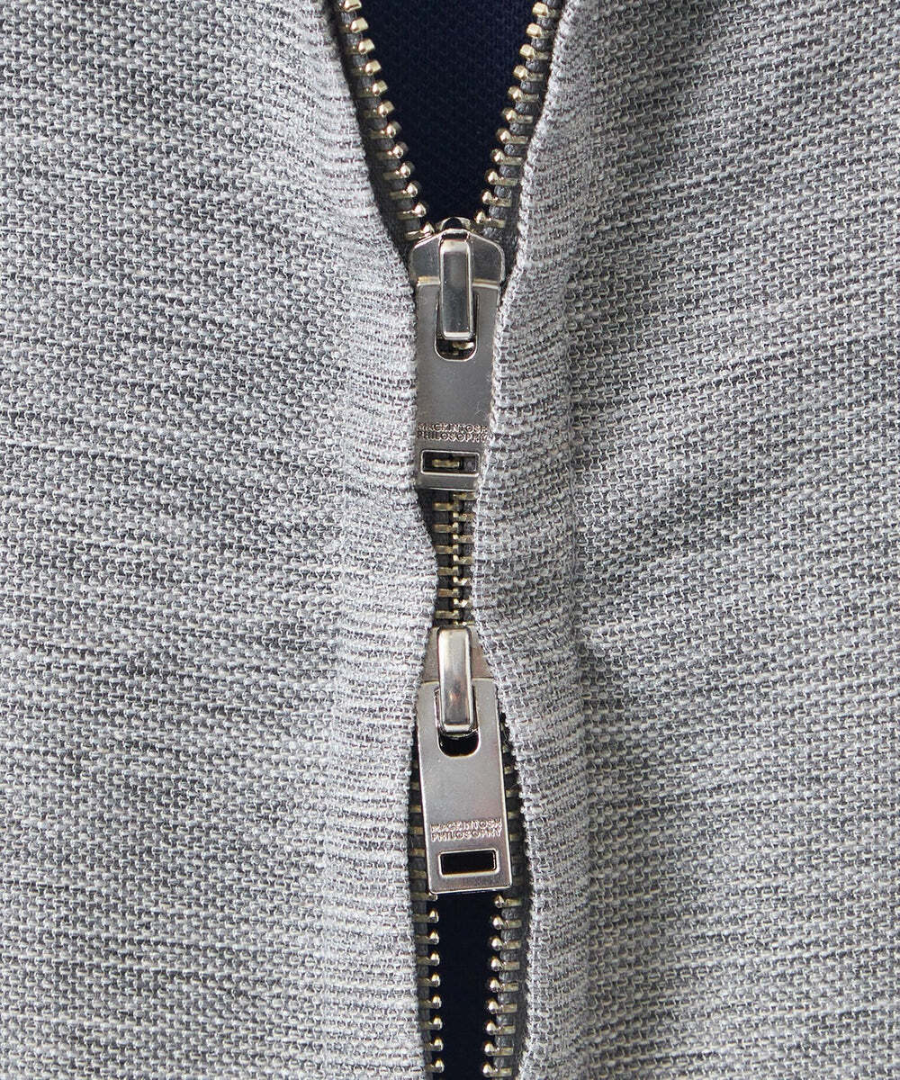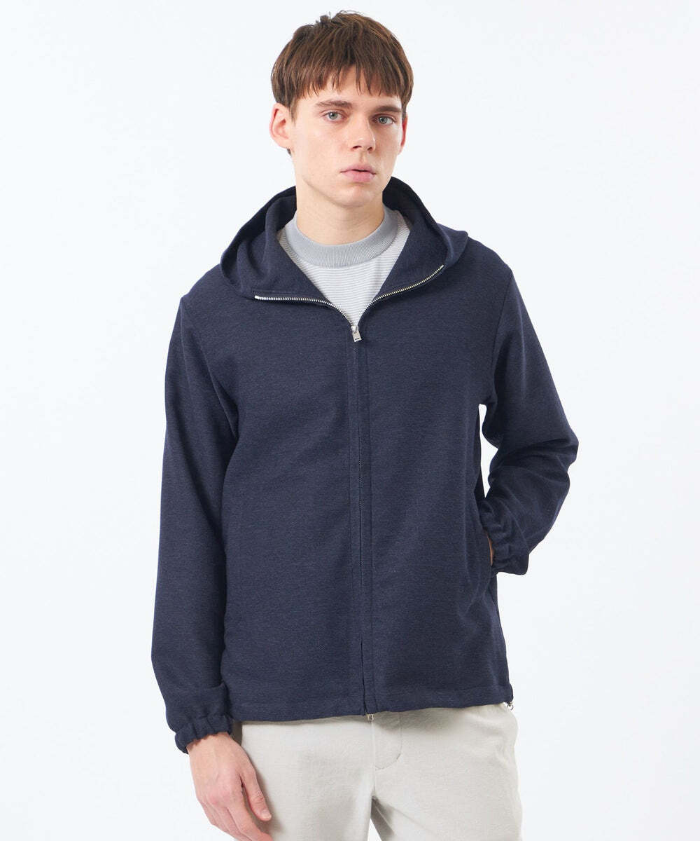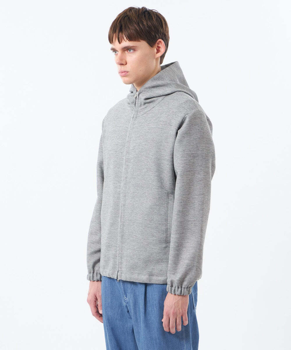 フロントジップ開きのフーデッドパーカー。裾にはスピンドルが入っているため、シルエットの調整が可能です。フードは上まで閉めると立ち上がり、シャープな印象になる仕様です。