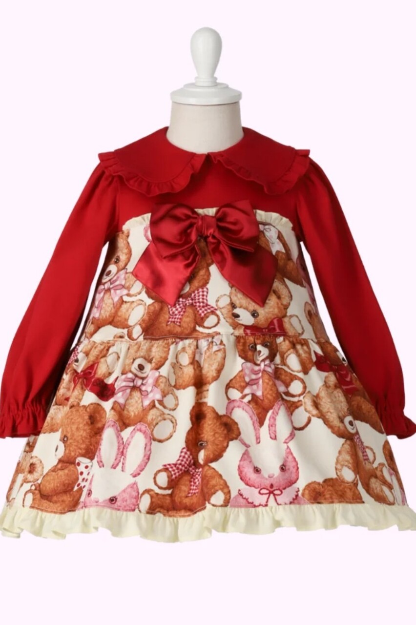 くまのぬいぐるみが全面に描かれているオリジナルプリントワンピースをご紹介いたします❤️