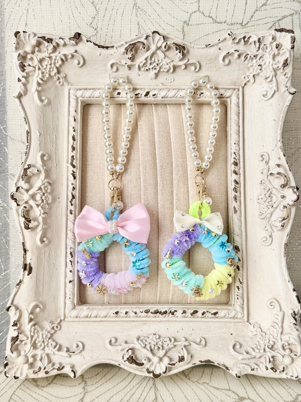 ■内容:パステルカラーのモールでリースを作り、キラキラパーツとリボンを貼付けて完成です。モールやパーツはお好みのものを選んでいただけます。(※数に限りあり)