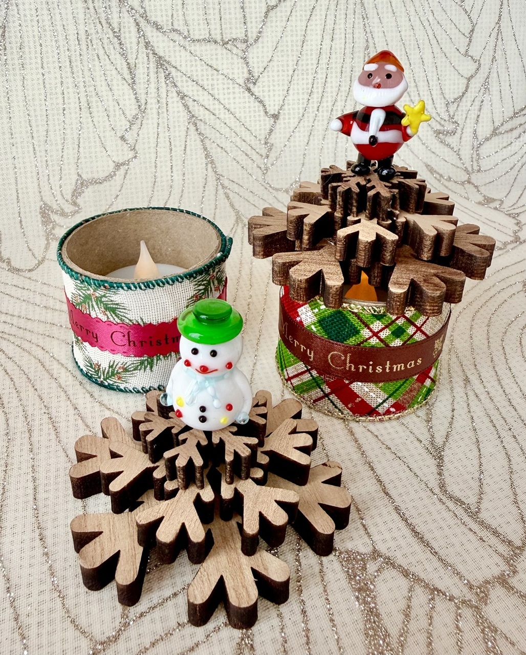 ■内容:ウッド素材のスノーフレークを重ね、トップにガラスオーナメントを貼付けます。キャンドルホルダーにはリボンを貼付け、中に電池式のキャンドルを入れて完成です。ガラスオーナメントはスノーマンとサンタクロースの2種類各4個限定です。※グルーガンを使用します
