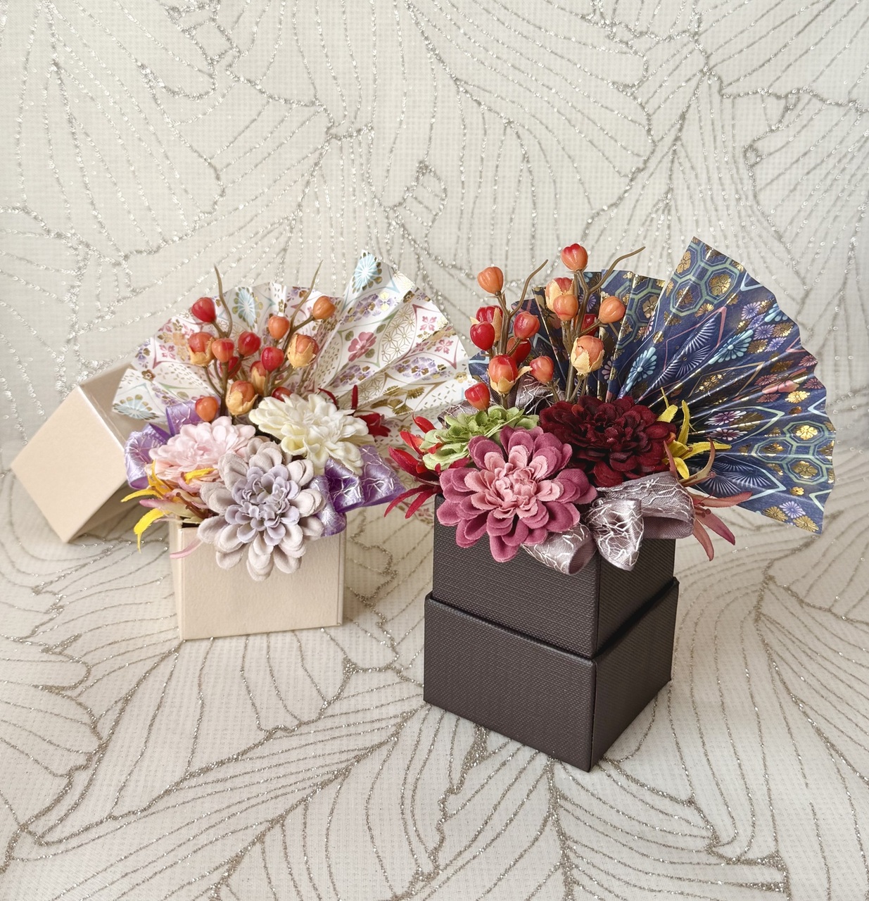 ■内容:折り紙で扇飾りを作り、ダリアやリリー、リボンなどをボックスにアレンジして完成です。ボックスの蓋を底に重ねて高さを変えることもできます。