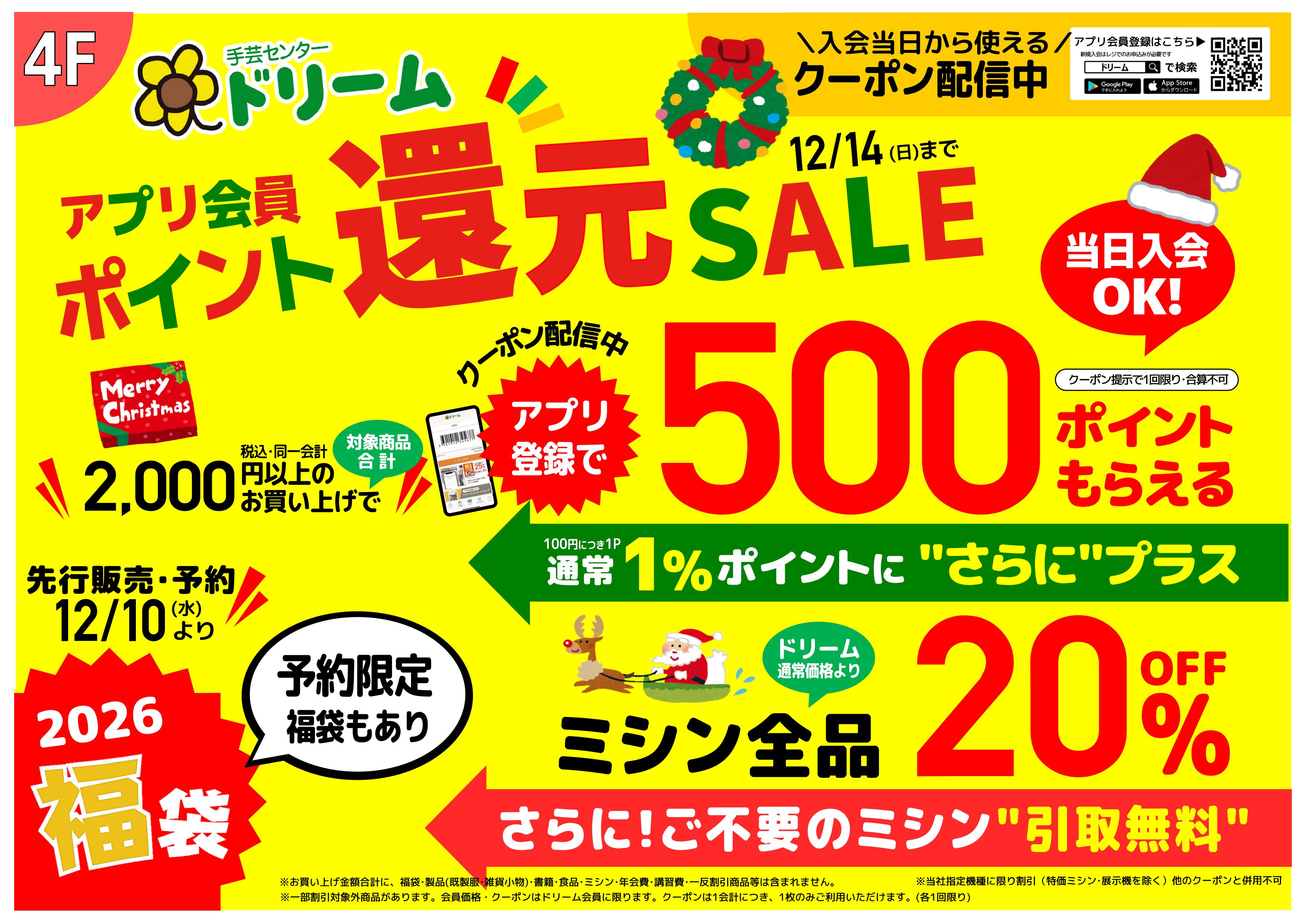 2,000円(税込)以上お買い上げで使える「ドリームポイント500Pプレゼント」アプリクーポンを12/14まで配信中です。