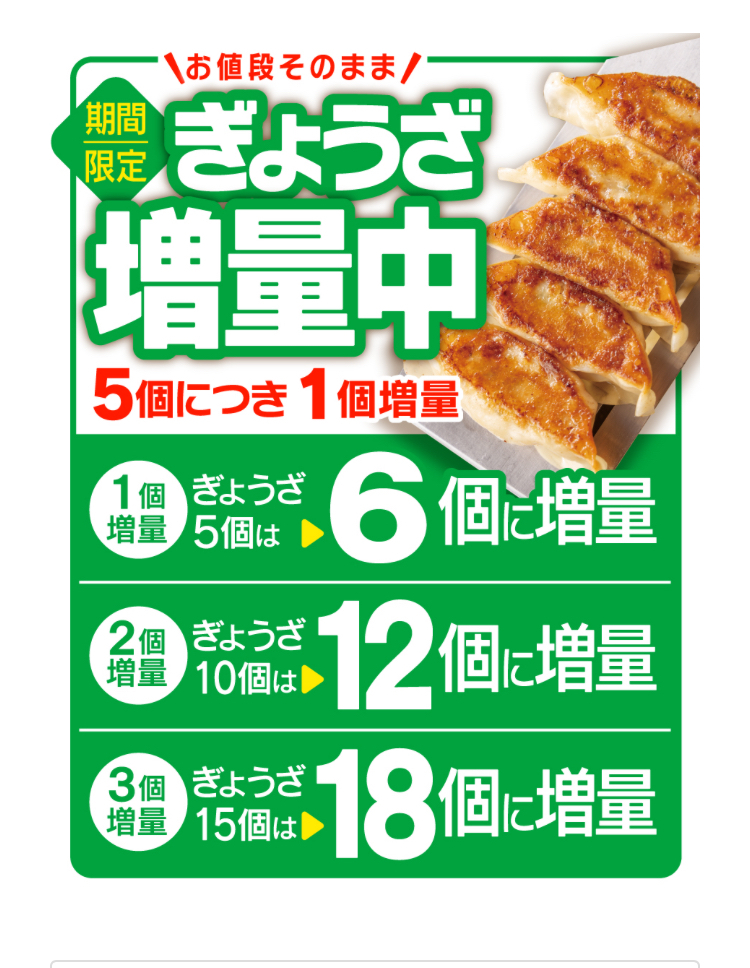 今だけお得なぎょうざ増量キャンペーンを開催中です。