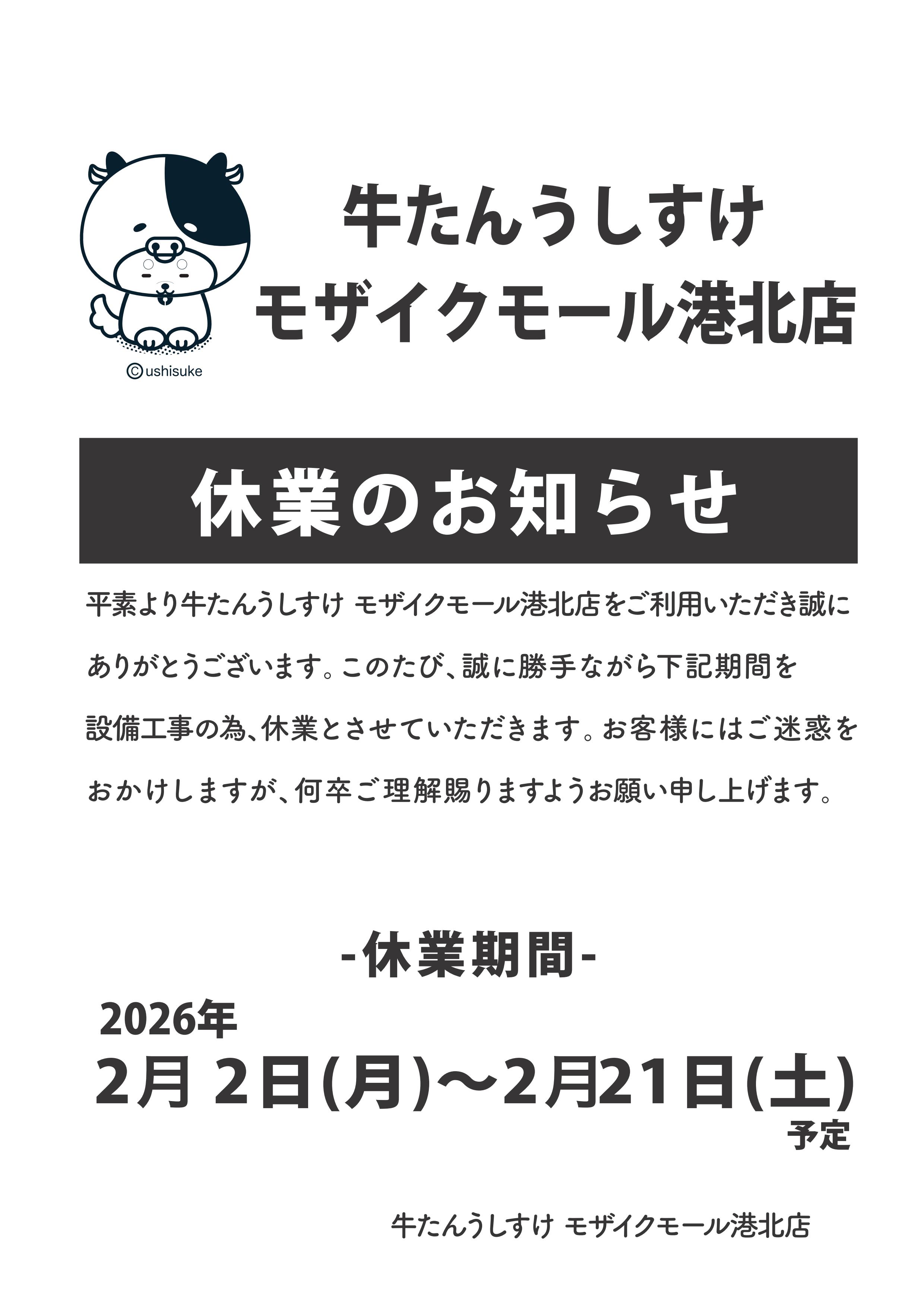 休業期間:2026年2月2日~2月21日(予定)