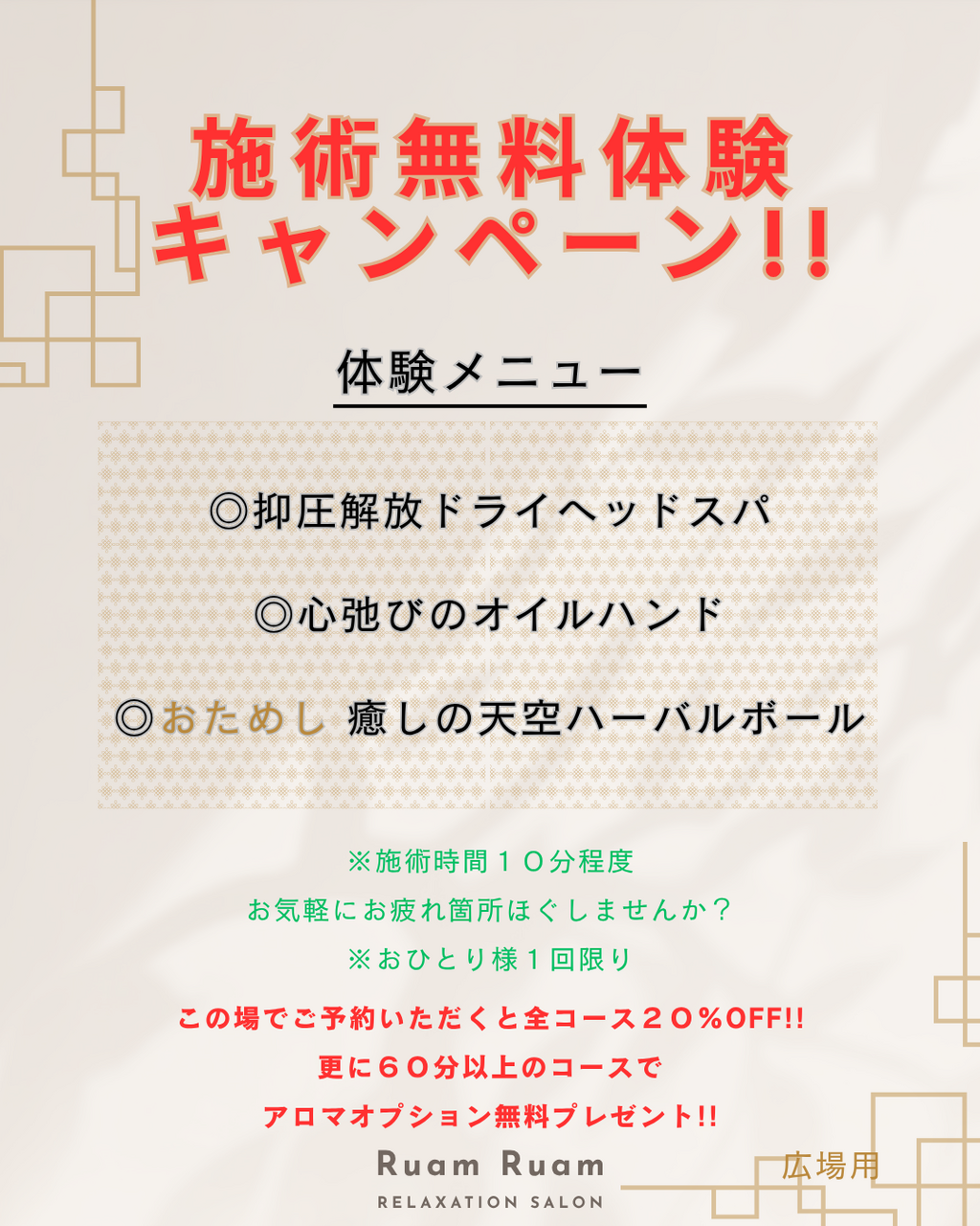 ドライヘッドスパ、オイルハンド、ハーバルボールなどの人気コースが今なら0円で受けられます!