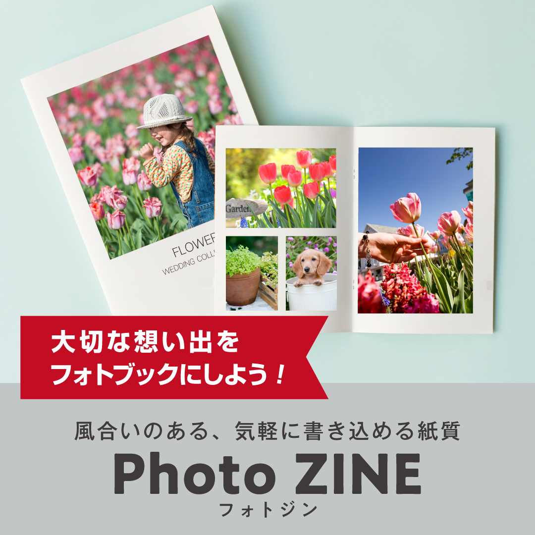 PhotoZINE:1枚1枚めくりやすい厚みのある紙を使用。文字やイラストを書き込んだりオリジナルな1冊に出来ます♪ こちらはネット注文になります。